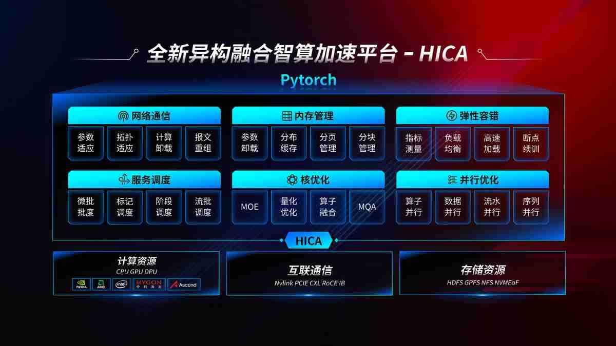 通过自研的服务层、、中间适配层、、、、以及调度编排算法,,采用数据并行、、模型并行等多种并行方式,,,把并行计算任务进行有效的分解,,,使其分别由相应的软件栈和算力资源来承接。。当GPU资源变化,,HICA可以实时动态调度计算子任务并调整模型拓扑和架构,,以充分聚合各种算力资源。。。