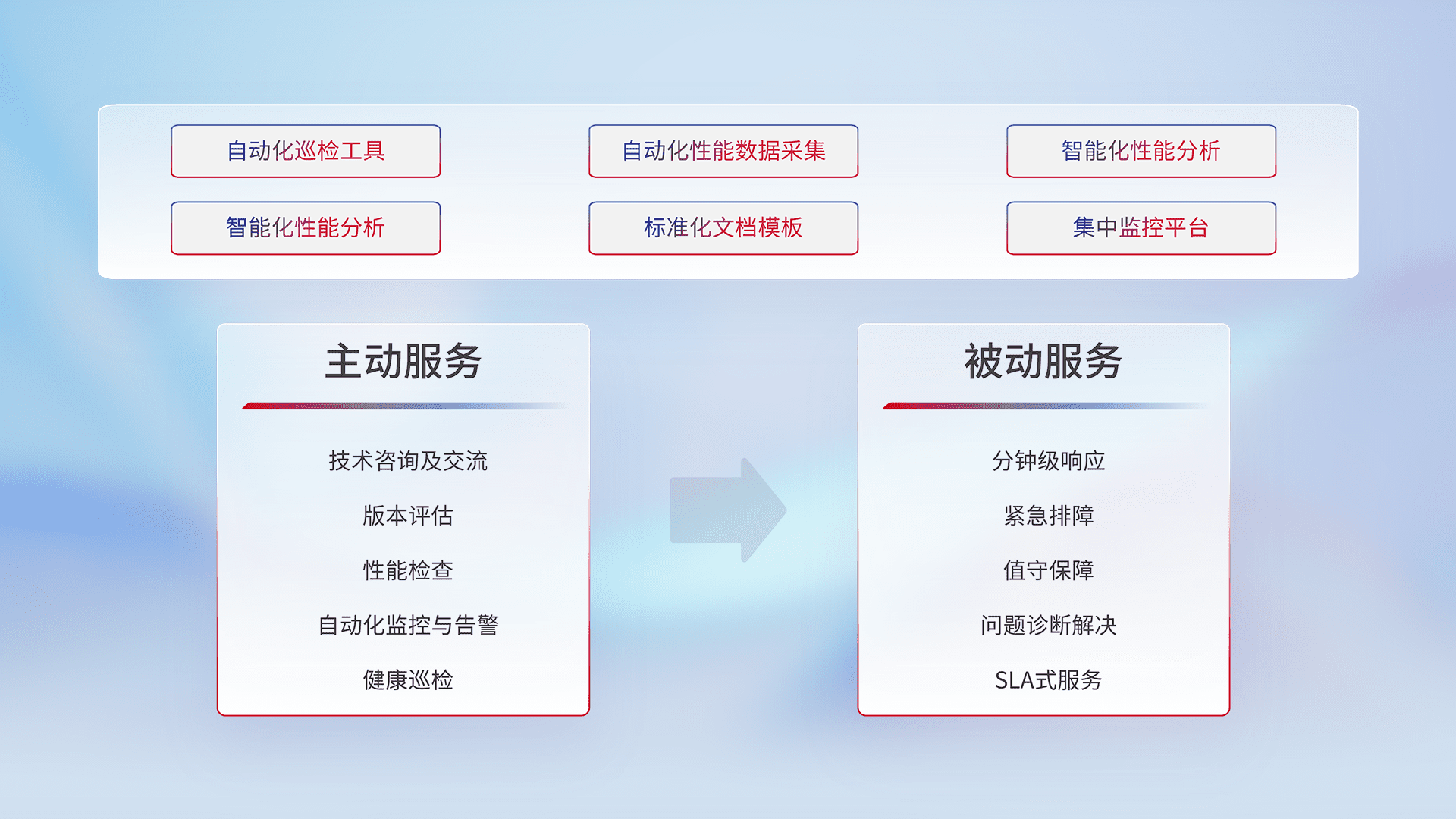 智能化工具和标准化文档,,,保障服务质量,,,提供主动服务(包含技术咨询、、、、版本评估、、、、性能检查、、自动化监控与告警、、、、健康巡检)和被动服务包含(分钟级响应、、、、紧急排障、、、值守保障、、、、问题诊断解决、、、、SLA服务)。。。